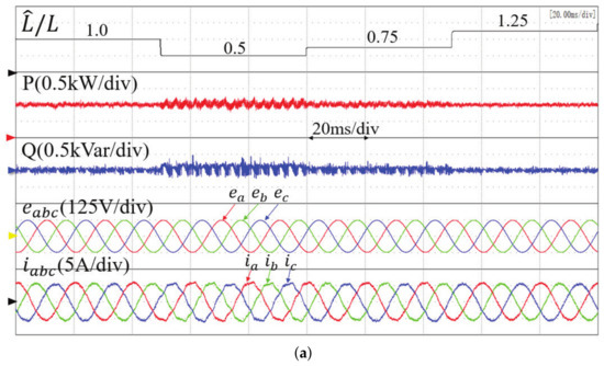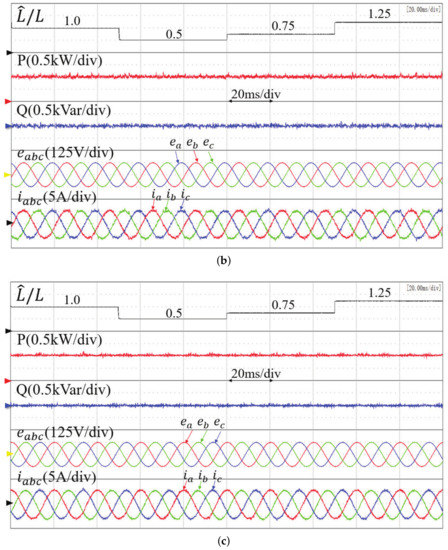 The experimental results of different control methods when the inductance changes are shown in Figure 7. The control performance of conventional MPPC, the proposed basic MFPPC, and the proposed improved MFPPC method were compared under four different values of the precise inductance parameter: L, 0.5 L, 0.75 L, and 1.25 L. The active power reference value was set to 1 kW. The conventional MPPC method produces large ripples in the active power and reactive power at 0.5 L and 0.75 L, and the grid current is distorted. In contrast, the proposed basic MFPPC method avoids the dependence on a precise system of parameters, the active power and reactive power remain constant, and the current is sinusoidal. The improved MFPPC method exhibits better steady-state performance than that of the proposed basic MFPPC method. Table 4 shows the THD of the grid current with inductance parameters of 0.5 L, 0.75 L, and 1.25 L. The THD of the grid current under the improved MFPPC method is smaller than the other two methods. This results verify that the best steady-state performance and strong parameter robustness are both achieved in the proposed MFPPC.
