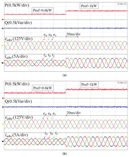 Figure 8 compares the dynamic responses of conventional MPPC, the proposed basic MFPPC, and the improved MFPPC method when the active power reference steps from 0.6 kW to 1 kW under symmetrical grid conditions. It is seen that, in each method, the active power can quickly track the reference power and the reactive power remains at zero to achieve the unity power factor. The total harmonic distortion (THD) of the grid current for the three control methods is shown in Table 5. When the parameters are accurate, the conventional MPPC method and improved MFPPC method have better steady-state performance than the proposed basic MFPPC method, and the best steady-state performance is achieved in the proposed improved MFPPC.