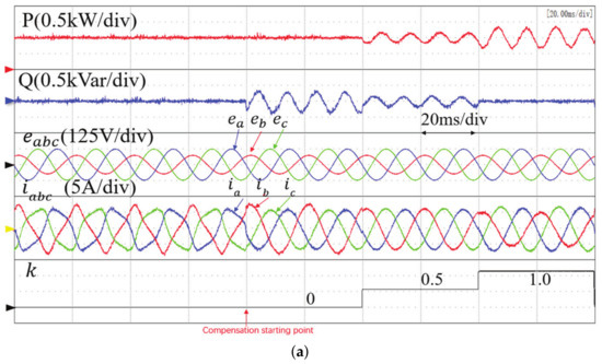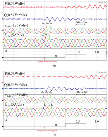 The results above were obtained under symmetrical and sinusoidal grid voltage conditions. Figure 10 presents the experimental results of the three methods under unsymmetrical grid conditions, where a one-phase dip of 40% was applied to the three-phase grid voltages. According to the different power compensation value, the three control targets were achieved with different values of compensation gain k. When or 0, the currents must be unbalanced to achieve the target of constant active power or constant reactive power. To achieve sinusoidal and balanced grid currents (), both the active power and reactive power must be oscillating at twice the grid frequency due to the interaction between the grid currents and the negative sequence grid voltages. It is seen that, before the power compensation, the grid currents are highly distorted. After the power compensation, the grid currents become sinusoidal. The steady-state performance of the proposed improved MFPPC is even better than that of conventional MPPC with the control targets I and II, as confirmed by the current THD comparison in Table 6. With control target III, the lowest current THD is achieved in conventional MPPC. The highest current THD is obtained in the proposed basic MFPPC. It should be noted that in Figure 10, the curve of is not presented due to the limited channels in the oscilloscope. However, the average value of output voltage is maintained at its reference value irrespective of a balanced or unbalanced network. The only difference is that the ripple of is proportional to the ripple of active power, as shown in [7]. As the focus of Figure 10 is to present the results under an unbalanced network, is replaced by the coefficient k in (24), which represents various targets under the unbalanced network. The results validate the effectiveness of the universal power compensation expression in (24).