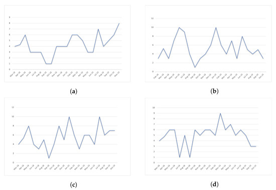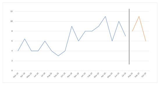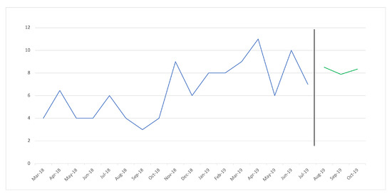 On the other hand, SMA does not use complex parameters nor the seasonal component; it only requires the last values to conduct the forecasting. Furthermore, ARIMA models try to describe the autocorrelations in the data, and it is composed of a combination of differencing with autoregression and a moving average model; these parts are described by the p, d and q parameters, respectively, in ARMIA (). It is important to highlight that 85% of the total time series were classified as white noise by ARIMA [28], meaning that they lack autocorrelation and have high levels of symmetry by having a uniform distribution of data, similar to a random walk process [26]. Therefore, it is difficult to forecast these series because they have the same probability for the series to go up or down.