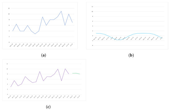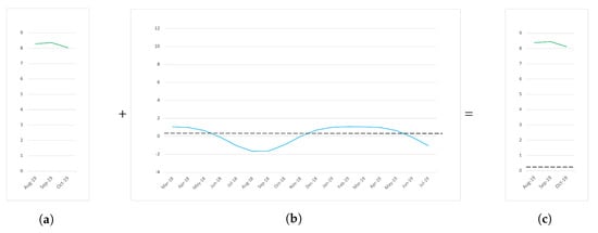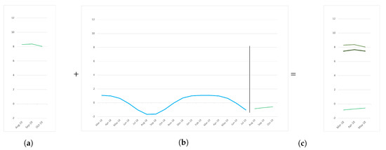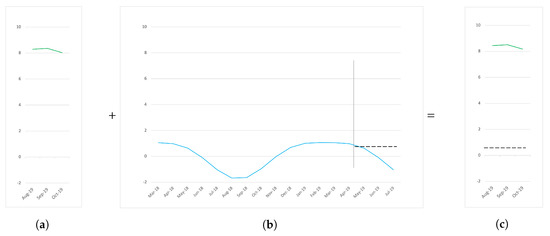 ReMS is the regular forecasting of the series minus the seasonal component. Figure 4 shows this technique’s scheme, where Figure 4a shows the train section of the series, Figure 4b is the seasonal component and Figure 4c shows the forecasting of Figure 4a minus Figure 4b, see Equations (2)–(4).
