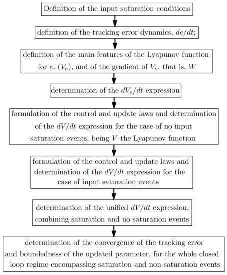- Formulation of the control and update laws and the determination of the expression for the case of input saturation events;