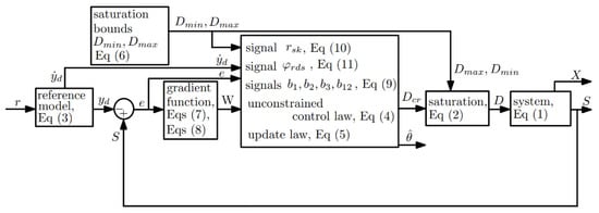 - Contribution Ci. The effect of input constraint limits and desired output on the convergence of the tracking error during input saturation events is determined. In contrast, in current adaptive AES-based control (for instance [,,,]), the convergence of the tracking error is determined in terms of the controller parameters, not in terms of input constraint limits or desired out.