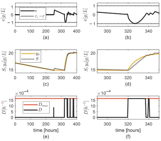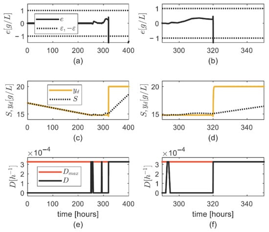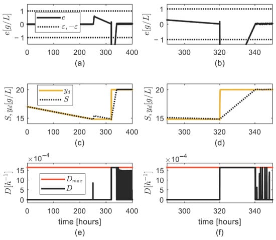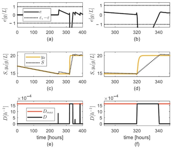 Simulation results for case 4: (a) Trajectory of the tracking error ; (b) detail of the trajectory of ; (c) trajectory of substrate concentration ; (d) detail of the trajectory of ; (e) trajectory of the control input ; (f) detail of the trajectory of .