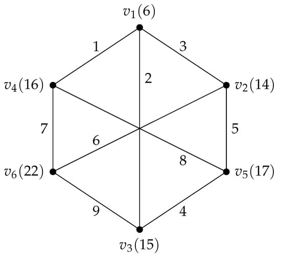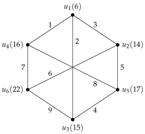 Figure 1, Figure 2, Figure 3 and Figure 4 illustrate the proof Theorem 2. An antimagic labeling of a 3-regular graph G and the antimagic labeling of a 2-regular graph H are given in Figure 1 and Figure 2, respectively. In Figure 3, the six copies of the graph H are considered with their labeling function . The rooted product of the graph G and H with their antimagic labeling is given in Figure 4. Here, the root vertex of the graph H is chosen as .