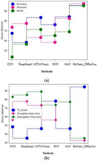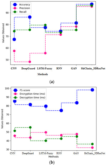 Figure 5. Analysis of existing and proposed method for dataset-1. (a); Accuracy, Precision and Recall comparison; (b) F1-score, encryption and decryption time analysis.