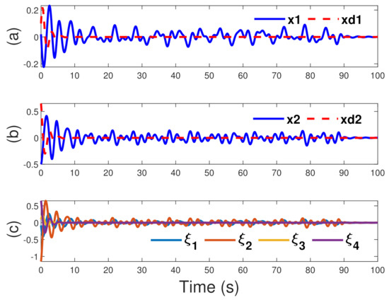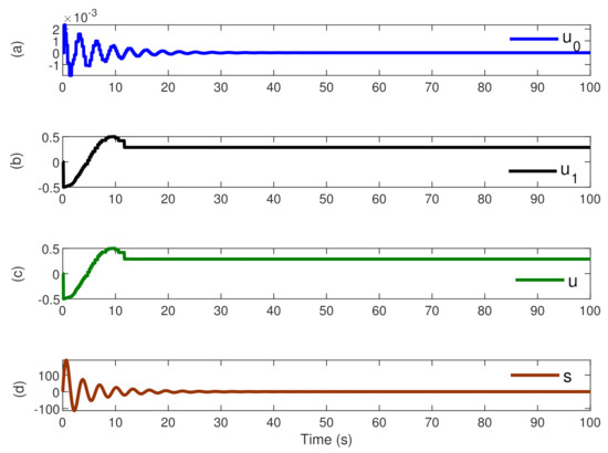 where is the angle position of robot arm, and is the control input. Moreover, M is the mass of the payload, is the moment of inertia, g is the acceleration of gravity, l is the length of the arm, and D is the viscous friction, where are the system parameters and are the design parameters. Set the values of the system parameters as , and , and the design parameters M and are alterable. Assuming and . Herein, consider the effect of interference on the actuator, so the dynamics by selecting the system parameters can be written as