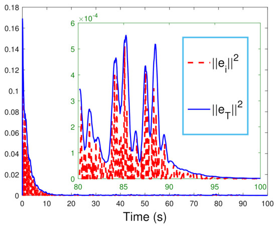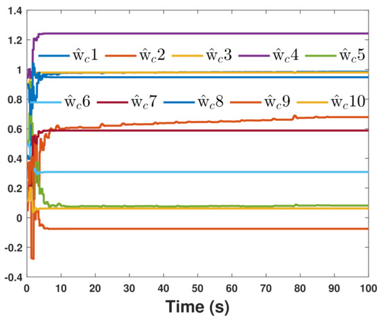 For simulation, the parameters of the algorithm are chosen as , , , . The parameters of the triggering condition are selected as , , , , , and . The initial NN weight is selected as and the NN activation function is designed as .
