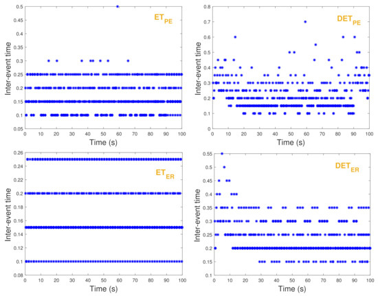 First, Table 1 shows the data comparison for the four control strategies. As is well known, the number of triggering events is one of most important factors in evaluating the triggering mechanism. Furthermore, a smaller number of triggering events can reduce the communication burden and save resources. To implement this goal, it is needed to reduce the unnecessary update of the controller guaranteeing system performance. Based on this, a novel adaptive adjustment technique consisting of DET via ER technique is used. In addition, with the help of the simulation experiment platform and MATLAB data package, using respectively the technology in [39,40] and our technique in this paper, some experimental results are shown in Table 1. From Table 1, it is obvious that the DET via ER technique is the best, and which can better reduce the communication burden and save resources, since there are only 418 samples that occurred because of the larger average triggering interval time 0.2392 s. In particular, one may notice that the ER technique is also beneficial in reducing the number of event-triggering comparing with the PE technique in the framework of the same event-triggered conditions. Similarly, the DET is also beneficial in reducing the number of event-triggering comparing with ET in the framework of the same PE technique (ER technique). In addition, the minimal interval indicates Zeno-free behaviors. The minimal interval values of the four strategies are consistent with Figure 7. Moreover, according to Figure 7, we know that DET via ER technique can generate a biggest minimal interval comparing with other technique, so the effectiveness of the current technique designed in this paper is verified.