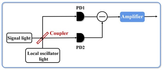The basic structure of a homodyne detector. In a homodyne detector, the signal light and local oscillator light are coupled by a coupler, then two outputs respectively go through a pair of photodiodes (PDs) so that the information contained in quantum states is transferred to differential current. The differential current then enters the electronic amplifier for further processing.