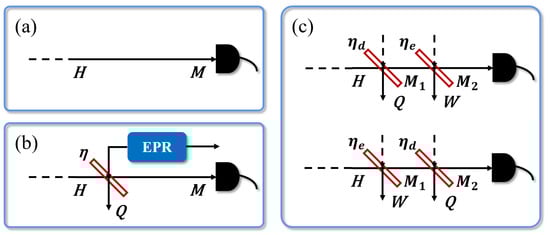 This is the relationship between two parameters and , both of which are used to describe electronic noise in different models. Another case presented in Figure 2c is a variation to describe the practical detector. The difference from the last one is the positions of two beam splitters.