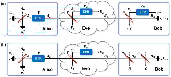 Complete EB scheme of the practical homodyne detector model over a fast-fading channel. Alice generates an EPR state and then heterodyne detects one of its modes, contributing to projecting the other mode into a coherent state. Alice sends the coherent state to Bob. The fast-fading channel is modeled as an EPR state with a variance of , where one mode is coupled into the system via a beam splitter with the transmissivity T. (a) represents the conventional detector model over a fast-fading channel. (b) represents the modified detector model over a fast-fading channel.