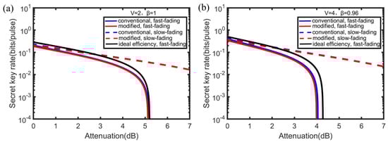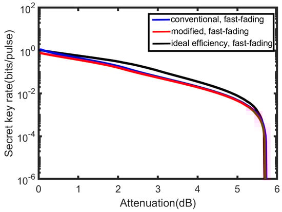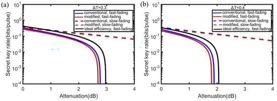 As shown in Figure 4, we compare the performance of the two detector models over the fading channels. The ideal situation in Figure 4a indicates that the key rate over the fast-fading attack is slightly lower than the slow-fading attack in a small scale of attenuation. Even the detector with the ideal efficiency over a fast-fading channel demonstrates a better secret key rate than the practical detector with imperfect efficiency over a slow-fading channel. However, the high secret key rate within the modeled detector is achieved with losses of about 4 dB against a fast-fading attack, where the rate starts to rapidly decrease and will fall to a very low value when suffering the attenuation of 5 dB. In the practical situation in Figure 4b, the attenuation point that the secret key rate begins to decrease sharply will move left to 3 dB for the modeled detector. In both the ideal case and the practical case, the secret key rate decreases smoothly, not sharply, against a slow-fading channel, hinting at the different effects on both sides of the communication between the fast-fading channel and the slow-fading channel. Besides, within the simulations, the performance of the modified model is almost similar to that of the conventional model. In other words, the conventional one is slightly better than the modified one in the small attenuation.