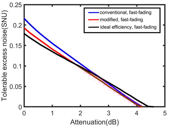 Figure 6 presents the maximal tolerable excess noise in a fast-fading channel. As can be seen, when the transmission attention is less than 2 dB, the detector with the ideal efficiency tolerates less excess noises than the practical detector while as the transmission attention increases, the detector with the ideal efficiency can resist more excess noises than others. Besides, the modified detector model can tolerate similar excess noises to the conventional one.