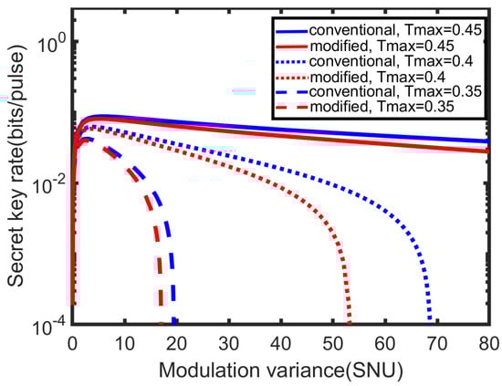 Figure 8 presents the secret key rate at the best modulation variance versus transmission attenuation in the ideal situation (). The best modulation variances for each transmission attenuation are different. We can compare it with Figure 4a and then conclude that the secret key rate is slightly better after using the best modulation variance. Furthermore, the attenuation point where the secret key rate begins to decrease sharply will move right to 5 dB for the modeled detector.