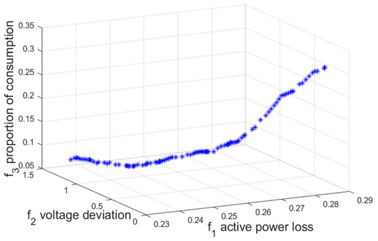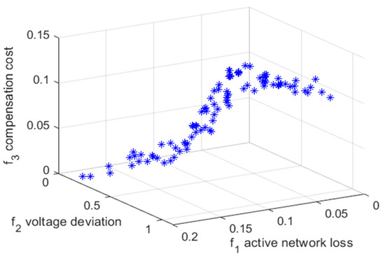 - Step 2: Update the personal best and leader for each particle. Carry out power flow computation and obtain the objective function values of each particle. The non-dominated solutions of the population are confirmed according to the non-dominated ranking strategy, and the positions of the next generation of particles and the individual optimal positions are updated according to Equation (13).