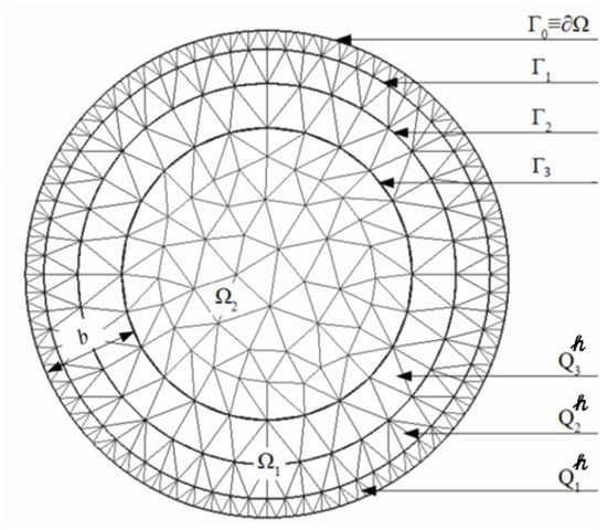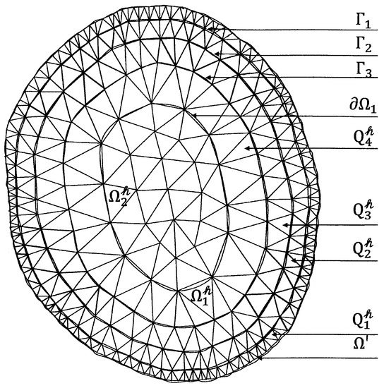 First, the nodes of the curve are connected by the broken line. Then, we connect each node on the curve , , with the nearest nodes on the curve . Thus, we triangulated the boundary strip with compression of the triangles to the boundary . We will call the set of the triangles with vertices on and a layer and denote it by . (Here h is the maximal length of the sides of the triangles in ). For instance, in Figure 1 the subdomain has the layers , and .