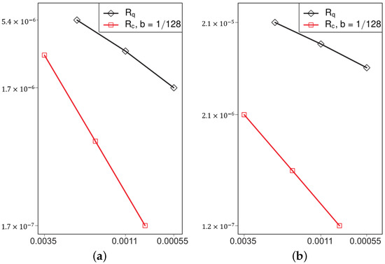 Error dependence on the parameter h for meshes and for model problem 1 (a) and model problem 2 (b).