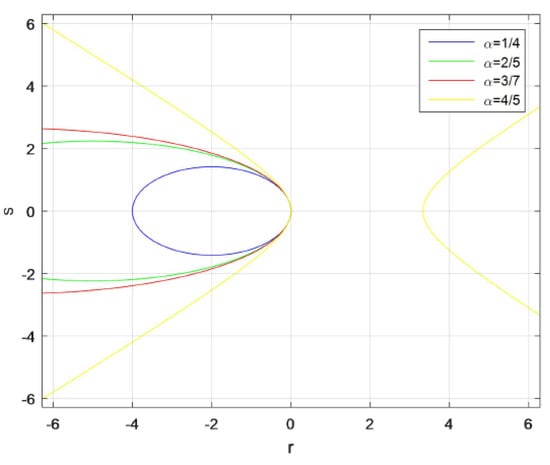 Select , , which satisfy Theorem 2; thus Equation (8) is stable in MS. Applying the semi-implicit Euler scheme, take , respectively. According to Theorem 4, the corresponding MS stability regions are depicted in Figure 1 by using Matlab software.