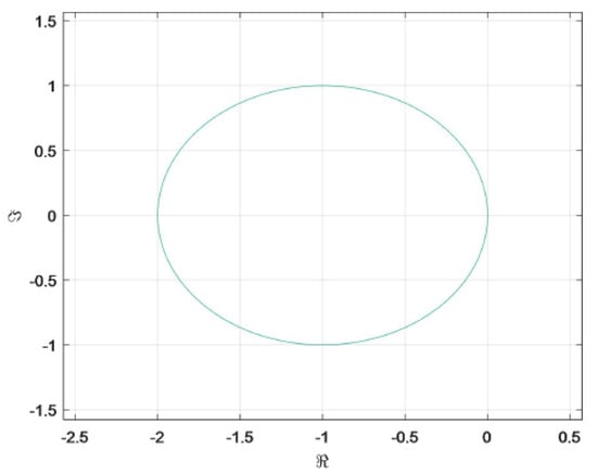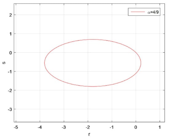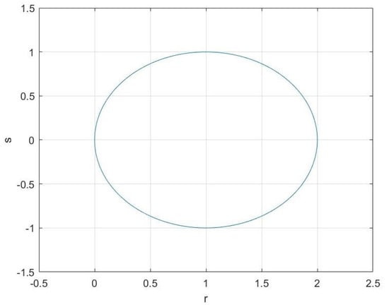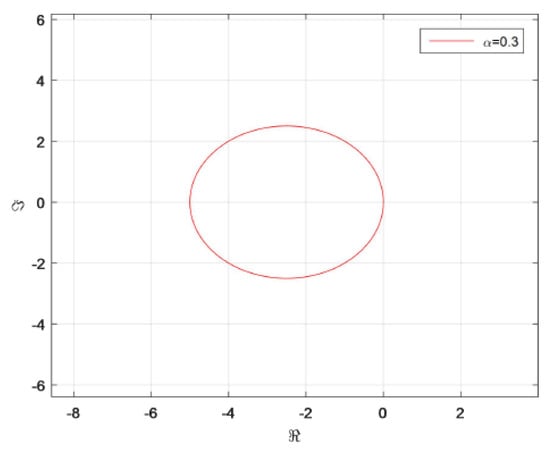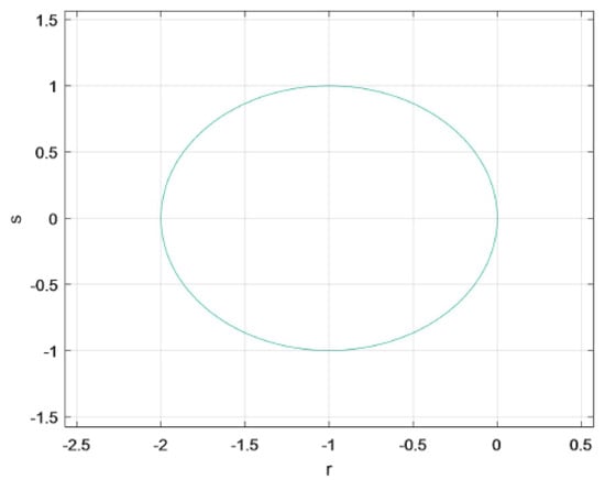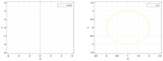 Since the region of the implicit fuzzy Euler method coincides with that of the semi-implicit fuzzy Euler scheme when , we only use the explicit fuzzy Euler schemes and the semi-implicit fuzzy Euler scheme to iterate, and take in the semi-implicit fuzzy Euler scheme to be , respectively. It follows from Section 4.1 that there is no s involved in the asymptotical stable functions , and we divide r into the real part ℜ and imaginary part ℑ. Then, the stable region of the explicit fuzzy Euler method is . Similarly, we can deduce the stable region expressed by ℜ and ℑ of the semi-implicit fuzzy Euler method based on Theorem 3. Then, the patterns of the region of asymptotical stability are given in Figure 2, Figure 3 and Figure 4. The stable region of the explicit fuzzy Euler method is the interior of the circle in Figure 2, the stable region of the semi-implicit fuzzy Euler method is the intersection of the left half plane and the exterior of the circles in Figure 3 and the right figure in Figure 4, and the stable region of the semi-implicit fuzzy Euler method is the left half plane in the left figure in Figure 4.