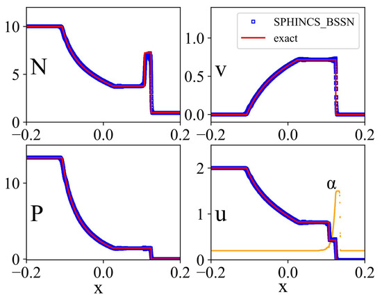 The SPHINCS_BSSN results (blue squares) are in very good agreement with the exact solution (red line). In the fourth sub-panel, we show in orange the dissipation parameter . It abruptly switches to just ahead of the shock front, stays constant around it, and decays in the post-shock region very quickly to the floor value. Overall, we have a very good agreement with the exact solution. Only directly behind the shock front (e.g., in velocity and density) is a small amount of noise visible. This is to some extent unavoidable, since the particles try to optimize their local distribution (see, e.g., Section 3.2.3 in [71]) and need to transition from their initial arrangement into a new one.