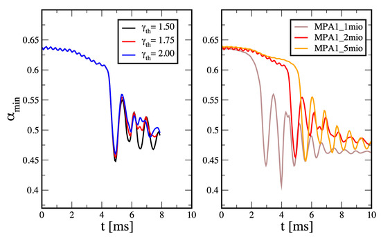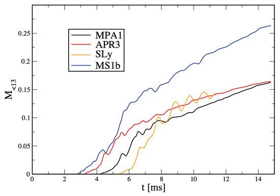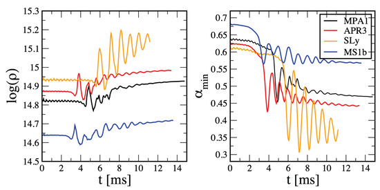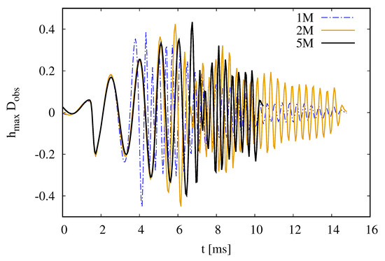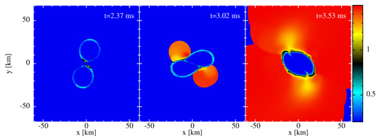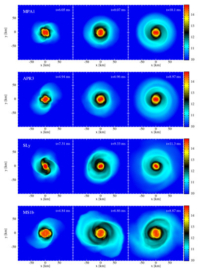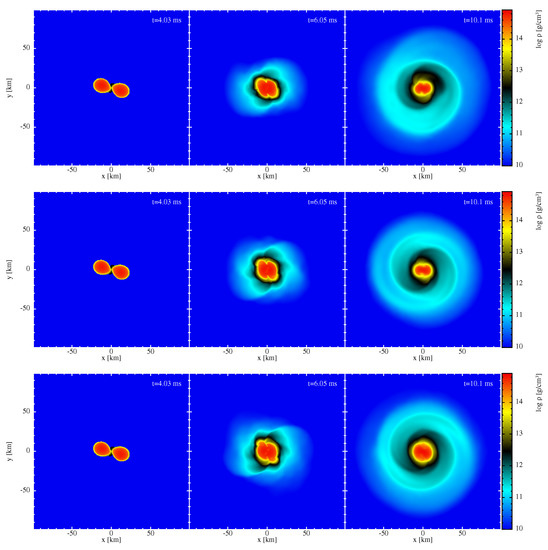 - Dietrich, T.; Bernuzzi, S.; Ujevic, M.; Brügmann, B. Numerical relativity simulations of neutron star merger remnants using conservative mesh refinement. Phys. Rev. D 2015, 91, 124041. [Google Scholar] [CrossRef]