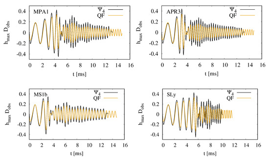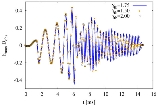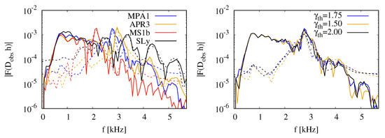 - Maione, F.; De Pietri, R.; Feo, A.; Löffler, F. Spectral analysis of gravitational waves from binary neutron star merger remnants. Phys. Rev. D 2017, 96, 063011. [Google Scholar] [CrossRef]