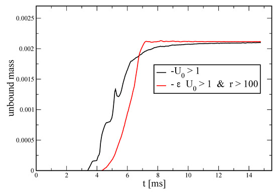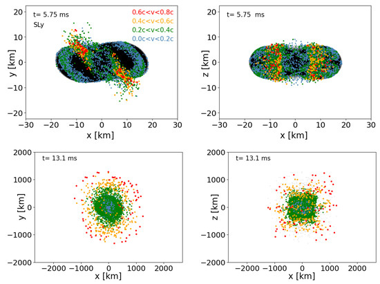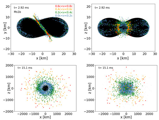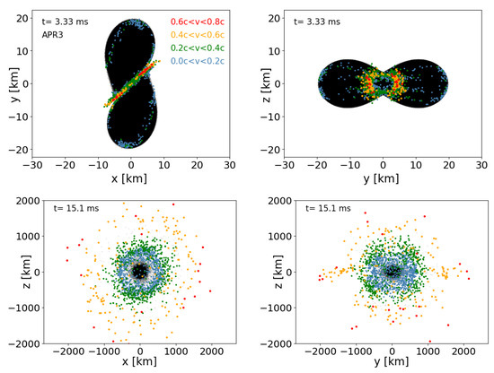 These violent multi-physics events can only be explored in a realistic way via full-blown numerical simulations. Thus, Numerical Relativity simulation codes have become valuable (but unfortunately, rather complicated) exploration tools. To date, there exists a “mono-culture” in the sense that practically all Numerical Relativity codes that solve the full set of Einstein equations make use of Eulerian hydrodynamics methods. We recently developed an alternative methodology [15,16] where we follow the conventional and well-tested approach to simulate the spacetime evolution via the BSSN formulation [17,18], but we evolve the fluid via freely moving Lagrangian particles. While the spacetime part is very similar to Eulerian approaches, the fluid part has additional advantages, in particular in following the material that becomes ejected in a neutron star merger. This material contains a small mass of only ∼1% of the binary system [19,20,21,22,23], but is responsible for all the electromagnetic emission and, therefore, of utmost importance for understanding the multi-messenger signals. Tracing these small amounts of matter with conventional Eulerian approaches is difficult, since (a) the accuracy of the advection of matter is resolution-dependent and the resolution away from the central collision site usually degrades substantially and (b) these methods employ artificial “atmospheres” to model the vacuum. The ejecta are expanding within these atmospheres, and this makes it hard to trace their properties with the desired accuracy. Within our particle approach, these challenges are absent since the vacuum simply corresponds to the absence of computational particles. Advection is exact in our approach: a property such as the electron fraction is attached to a particle, and it is therefore simply “carried around” as the particle moves, without any loss of information. Equally important is that, in our case, the neutron star surface remains perfectly well-behaved and does not need any special treatment, while it is a continuous source of concern in Eulerian neutron star simulations. There, the sharp transition between high-density and the vacuum, on a numerically difficult to resolve length scale, can easily lead to failures in recovering the primitive variables and to an effective reduction of the convergence order [24].