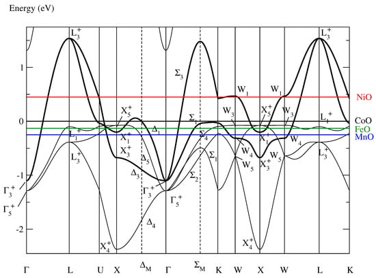 Conventional band structure of paramagnetic fcc CoO as determined in [] serving in this section as approximation of the band structures of paramagnetic fcc NiO, FeO, and MnO when the Fermi energies are adjusted. The colored horizontal lines denote the different Fermi energies, and the insulating band of CoO is highlighted by the bold lines. The symmetry labels are defined in Table A1 of [].