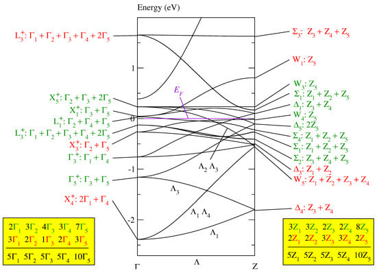 In the tetragonal Brillouin zone, the fcc band consists of branches. In Figure 2, the symmetry of the Bloch functions is given, first, at the equivalent point in the fcc Brillouin zone and then, after the colon, in the tetragonal body-centered Brillouin zone. The equivalence of the symmetry points is specified in Table A5 of []. The representations and of the body-centered tetragonal space group are defined in Table A2 of []. Each of the eight representations , , , , , , , and occurs exactly five times and each of the two representations and exactly ten times in the band, as indicated by the third line in the boxes in Figure 2. Thus, the Bloch functions of this band can be unitarily transformed into five sets of optimally localized Wannier functions symmetry-adapted to , where each set contains eight Wannier functions, see Table A4 of []. These eight Wannier functions may be constructed in such a way that they are situated either at the eight Mn or the eight O atoms, as detailed in Section 5.2 of [].