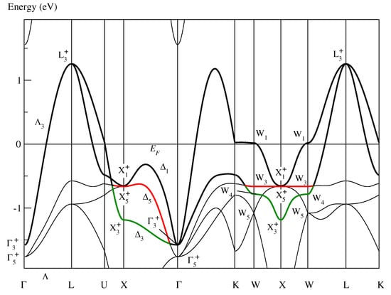 Conventional band structure of paramagnetic fcc NiO as determined in [] showing “band red” and “band green” defined in the text. As in Figure 1, the symmetry labels are defined in Table A1 of [].