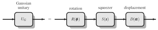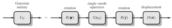 An efficient approach dealing with Gaussian unitaries and Gaussian states is based on the decomposition of the so-called fundamental Gaussian unitaries (FGUs), which are given by displacement, rotation, and squeezing, as shown in Figure 1.