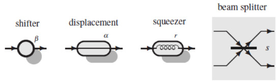 They are: (1) single-mode displacement; (2) single-mode rotation operators, briefly shifters; (3) single-mode real squeezers; and (4) beam splitters (BSs). Figure 3 shows the graphical symbols we use for these components.