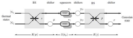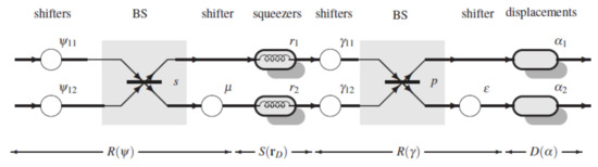 We are now ready to draw the Gaussian unitary of Theorem 1 with primitive components (see Figure 5). Note that this architecture can be used to specify the whole class of two-mode Gaussian unitaries. It is given by six shifters, two BSs, two real squeezers, and two displacements, corresponding to 14 real variables, in agreement with (8).