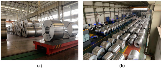 Metal rolls in a non-ferrous-metal processing warehouse: (a) a metal roll image taken from the top; (b) a metal roll image taken from the side.