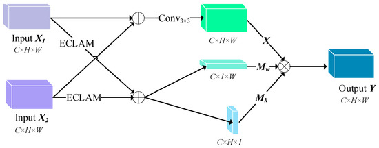 Figure 3 shows the structure of ECLAM which mainly includes two parts. One carries out a series of operations to factorize the input feature map into two one-dimensional feature vectors and in the horizontal and vertical directions, respectively, where is the number of channels, and and denote the height and width, respectively. The other gives different weights to various features in through the extracted attention vectors and , in order to obtain the final feature map , which contains rich and key location information. The overall process of ECLAM is summarized in Equation (2), where denotes element-wise multiplication.