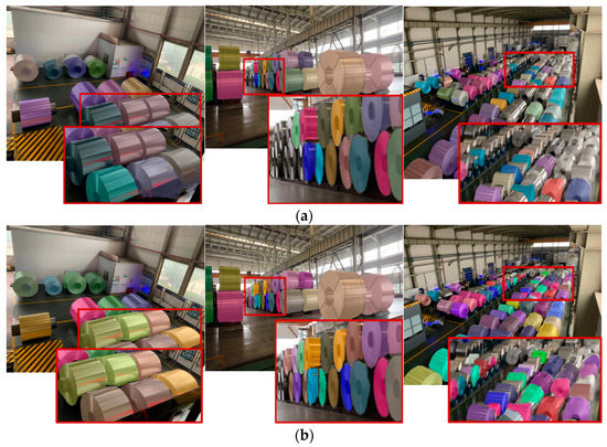 Mask R-CNN [22] is a general network framework that has been developed based on Faster R-CNN. It is used to solve the problem of multi-scale object detection and has resulted in considerable achievements in many fields [23,24]. In order to verify the detection performance of the algorithm fairly and intuitively, the backbone network of Mask R-CNN was set as ResNet-50 + FPN. The detection results for both are shown in Figure 6. In order to clearly distinguish the differences between them, the differences in the image are marked and enlarged within red boxes. According to the comparison results, the first column contains some images of large-scale metal rolls. L-MSNet network correctly detected all metal rolls in the image, while Mask R-CNN missed some of them. The second and third columns clearly show the advantages of L-MSNet in detecting small and medium-sized metal rolls. Here, L-MSNet successfully detected more metal rolls. Even small and medium-sized metal rolls with serious occlusal problems could be successfully detected with higher confidence scores. The experimental results show that L-MSNet can solve the problem of detecting multi-scale metal rolls better than Mask R-CNN.
