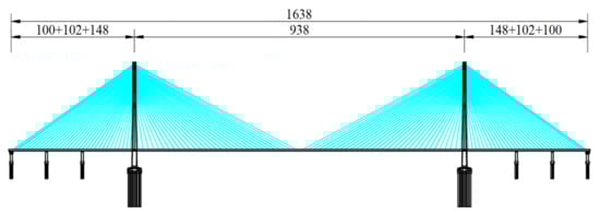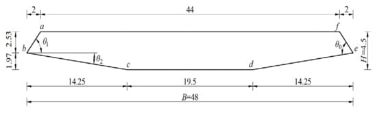 Qingshan Yangtze River Bridge is a crucial project of Wuhan Fourth Ring Road crossing the Yangtze River. The bridge’s total length is 1638 m, the main span is 938 m, and its span layout is arranged as (100 + 102 + 148 + 938 + 148 + 102 + 100) m, as shown in Figure 1. At present, the Qingshan Yangtze River Bridge is the largest full-floating cable-stayed bridge in the world. It has the world’s tallest A-type concrete bridge towers with a height of 279.5 m and fan-shaped double-cable planes. The main girder of the bridge adopts an integral flat steel box girder, and the cross-sectional geometry is shown in Figure 2. The total width of the steel box girder cross-section B = 48 m, which is the widest bridge across the Yangtze River. The height at the centerline of the box girder is H = 4.5 m. Since the Tacoma Bridge was destroyed by wind, the wind-resistant research of large-span flexible bridges has attracted much attention. This paper will take the section of the flat steel box girder of Qingshan Yangtze River Bridge as the basic section and establish a sample set of cross-sections by scaling its width and height in a certain proportion so as to develop the research on the prediction of flat steel box girder’s flutter derivatives.