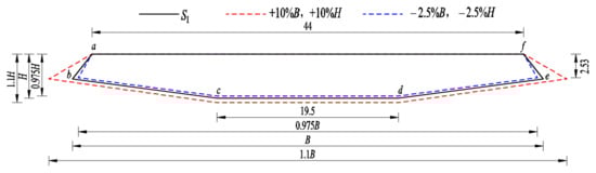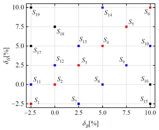 In this paper, the main girder cross-section of the Qingshan Yangtze River Bridge is used as the base section S2 with the width B = 48 m. As shown in Figure 3, the width variate is ΔB, and the relative width variate of the section is δB = ΔB/B, namely the width variation rate of the flat steel box girder section. The section height parameter δH is defined in the same way. Furthermore, considering that the investigated cross-section shapes should conform to the actual cross-section requirements of the main girder, this paper sets three constant cross-section shape parameters. The width of the top plate is 44 m, the width of the bottom plate is 19.5 m, and the vertical height of the nozzle tips e and b from the top plate is 2.53 m. As shown in Figure 3, the red dotted line is the cross-sectional profile considering δB = +10% and δH = +10%, and the blue dotted line is the cross-sectional profile considering δB = −2.5% and δH = −2.5%. A reasonable range of parameters δB and δH is considered from −2.5% to +10%. As shown in Figure 4, a flat steel box girder cross-section with parameters δB and δH is expressed as a sample parameter point (δB, δH). By changing the parameters δB and δH, 19 flat steel box girder cross-sections are established as the investigated objects. In Figure 4, the flutter derivatives of the steel box girder cross-sections corresponding to the blue and black points will be used to create the Kriging models. In addition, the flutter derivatives of the steel box girder cross-sections corresponding to the red points will be compared with the flutter derivatives predicted by the Kriging models. The size of each cross-section is shown in Table 1. The maximum section width is 52.8 m, and the minimum is 46.8 m. The maximum section height is 4.95 m, and the minimum is 4.3875 m. The maximum of section air nozzle angle θ0 is 70.8°, and the minimum is 36.12°.