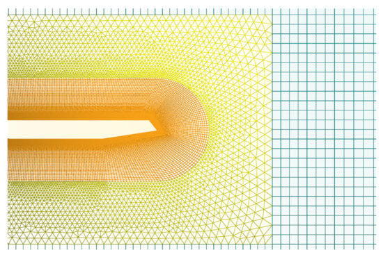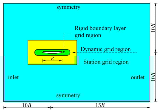 The flow field is divided into rigid boundary layer grid region, dynamic grid region, and static grid region, as shown in Figure 5. In order to meet the different functional requirements of each flow field region, this paper uses two kinds of grids to divide the flow field, namely structured grid and unstructured grid. The grid meshing of the computational flow field is shown in Figure 6. The rigid boundary layer grid region and the static grid region have many grids, and the grid size needs to be controlled to increase according to a certain proportion. Therefore, the structured quadrilateral grid is used for the two regions. The structured quadrilateral grid of the rigid boundary layer region is shown in Figure 7. The shape of the dynamic grid region changes during the calculation process, and the spring smoothing method is used in the subsequent calculations. However, the spring smoothing method can only be applied to unstructured grids. Therefore, the dynamic grid region is meshed by the unstructured triangular grid, as shown in Figure 8. In order to make the calculation result correct, for the rigid boundary layer grid region, the mesh thickness of the first layer near the wall is set to be about 1.04 × 10−4B, and the growth factor is controlled to 1.1.