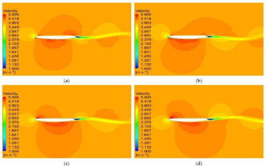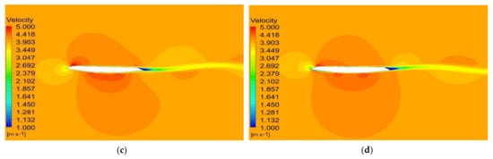 Wind speed field around a steel box girder S2 with a vertical motion under 4 m/s wind speed: (a) t = T/4; (b) t = T/2; (c) t = 3T/4; (d) t = T.