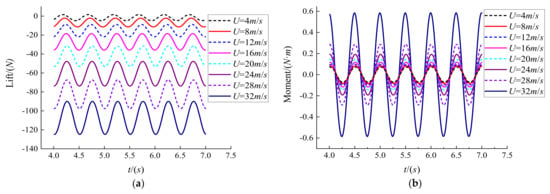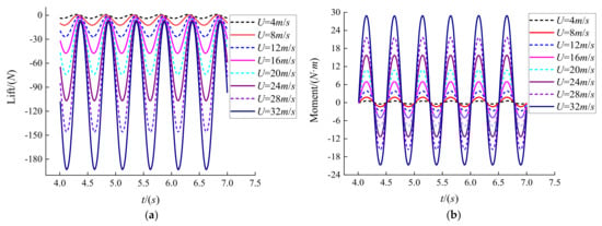 Figure 10a shows the lift of the thin plate under vertical forced vibration at various incoming wind speeds. The mean lift time history of the thin plate decreases with the increase of incoming wind speed, which is caused by the negative lift coefficient of the thin plate at a zero angle of attack. Figure 10b is the time history of the moment of the thin plate under vertical forced vibration at various incoming wind speeds. The mean torque time history of the thin plate is about zero, but its amplitude increases with the increase of incoming wind speed. Since the vibration frequency of lift and moment time histories is determined by the force motion frequency, the frequency of lift, lift moment, and forced displacement time histories are the same.