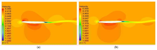 In the same way, by forcing the investigated steel box girders to do simple harmonic torsional vibration as with the amplitude = 2π/180, the aerodynamic forces of each flat steel box girder are also calculated at various wind speeds. Similarly, under 4 m/s wind speed, the wind speed field around the steel box girder S2 undergoing torsional forced motion in a period T is shown in Figure 11. With the torsional forced motion of the cross-section model, the wind speed field changes significantly. Under various wind speeds, the time history of aerodynamic forces on the steel box girder undergoing torsional forced motion can be obtained, as shown in Figure 12. Figure 12a is the lift time history of the thin plate under torsional forced vibration at various incoming wind speeds. The fluctuation of the lift time history of the thin plate increases significantly compared with Figure 10a because the forced torsional motion changes the initial attack angle of the thin plate. Figure 12b shows the moment of the thin plate under torsional forced vibration at various incoming wind speeds. Its amplitude increases significantly compared with that in Figure 10b, which is also caused by the initial attack angle of the thin plate caused by torsional forced motion.
