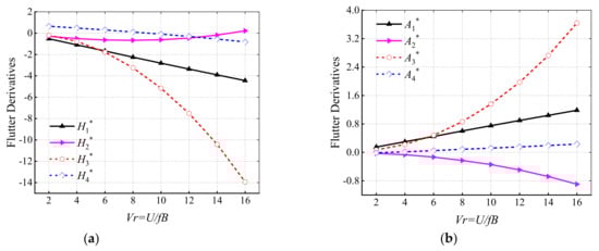 The flutter derivatives , , and are obtained by solving this system of equations. Increasing the wind speed U step by step, the curves of 4 flutter derivatives changing with the converted wind speed Vr can be obtained.