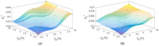 Under the converted wind speed Vr = 2, the flutter derivatives of the 13 steel box girder sections corresponding to the blue and black points shown in Figure 4 are selected for the Kriging model training. As shown in Figure 14, the response surface of each flutter derivative can be obtained from the Kriging model output. The response surface can reflect the variation trend of the corresponding flutter derivative in the design domain of the entire cross-sectional shapes. Apparently, the flutter derivatives H1*, H2*, H3* and A2* show an increasing trend with width and height. On the contrary, H4* and A4* decrease with the growth of width and height. Furthermore, A1* and A3* decrease first and then increase as the width increases. It can also be seen from Figure 14 that the influence of the girder width on flutter derivatives is more significant than that of the girder height because the change of the flat steel box girder’s width greatly influences the aerodynamic lift and lift moment.