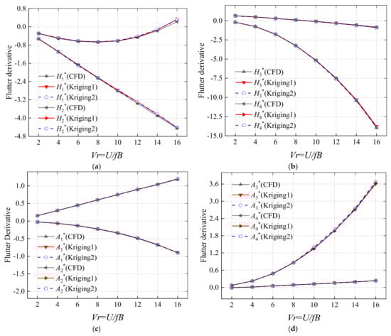 In the application of practical engineering, the process of predicting flutter derivatives can be divided into two stages. In the first stage, it is necessary to perform the verification both spatial and temporal for the CFD meshes and adjust the CFD model parameters according to the wind tunnel test results to realize the effectiveness of CFD numerical simulation. In the second stage, the Kriging predictions on flutter derivatives of flat steel box girders are performed based on the aerodynamic derivatives of a small number of cross-sections calculated by CFD numerical simulations. The main content of this paper is for the second stage to propose a data-driven prediction method based on the Kriging model to predict flutter derivatives of the bridge deck section, while the verification involved in the first stage was not considered due to the lack of wind tunnel test data in this paper. However, it needs to perform the verification in practical application, which will be analyzed in the following research.