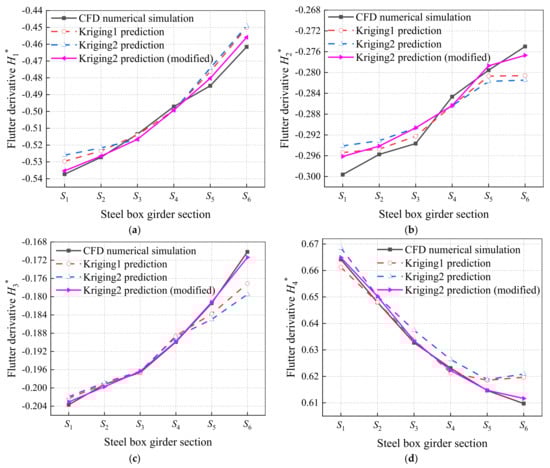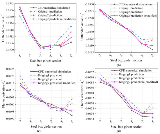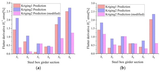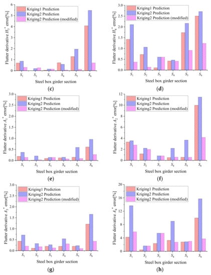 It can be seen from Figure 16 and Figure 17 that compared with Kriging2 prediction, Kriging1 prediction for the flutter derivatives of steel box girder sections is closer to the CFD numerical simulation. The reason is that Kriging1 prediction has more training samples than Kriging2 prediction. However, Kriging2 prediction can be improved by the modified method of Kriging model training, which repeatedly takes the predicted flutter derivatives of Kriging2 to increase the training samples of the model and update the trained Kriging models. As shown in Figure 16 and Figure 17, the modified Kriging2 prediction is superior to the Kriging2 prediction. Even for some girder sections such as S1, S5 and S6, it is closer to the CFD numerical simulation than the Kriging1 prediction. The errors of flutter derivatives predicted by Kriging1, Kriging2 and modified Kriging2 are shown in Figure 18. The flutter derivative errors of S1, S5 and S6 are significantly larger than those of S2, S3 and S4. The reason is that the girder sections (such as S7~S19 in Figure 4) used to train Kriging models are not evenly distributed in the girder section design domain. Obviously, the errors increase with the decrease of training samples from S7~S19 to S7~S14. However, the modified method of Kriging model training can effectively improve the prediction accuracy under a small number of training samples.