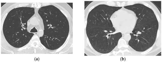 Positive and negative images in the SARS-CoV-2 Ct-Scan dataset. (a) CT scan of a patient infected with COVID-19; (b) CT scan of a patient not infected with COVID-19.