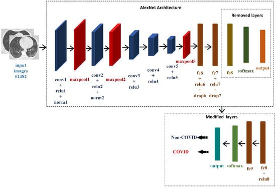 Due to the high performance of CNNs in various image recognition applications, they are highly preferred [37,38]. In this study, to classify the CT-scan images, a modified AlexNet (mAlexNet) created by using transfer learning is used. AlexNet is made up of 25 layers together with a convolution layer, Rectified Linear Unit (ReLU), fully connected (fc) layer, normalization layer, pooling layer, etc. The three layers at the end of the AlexNet model have been slightly modified (fine-tuning) to be compatible with existing study inputs. In order to distinguish whether a CT image shows COVID-19 or not, these final three layers are removed. Other parameters of the pre-trained AlexNet architecture are retained. Instead of the removed layers, new layers suitable for this study are added, as in Figure 3. This new architecture is called the modified AlexNet (mAlexNet). In the fc8 layer of pre-trained AlexNet, the number of the neurons is 1000. The number of features used for classification in our application is 25. Therefore, the number of neurons in the fc8 layer is changed to 25 in the mAlexNet architecture. In Figure 3, the mAlexNet structure is presented. Table 1 shows the layer parameters and training options of mAlexNet. When the training options are examined, it can be realized that the Mini Batch parameter, which provides the training data to be divided into smaller parts, is 40. The optimization algorithm Stochastic Gradient Descent with Momentum (SGDM) is applied to reduce the training error. Parameters of the SGDM algorithm are also shown in Table 1.