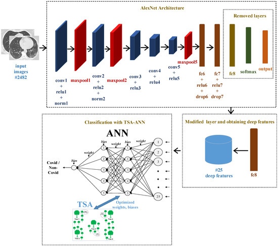 In this study, a DL-based COVID-19 detection system using CT-scans is proposed. A publicly available SARS-CoV-2 CT scan dataset [35,36] is used in this study. The dataset includes 1230 and 1252 CT scans of uninfected and infected patients, respectively. The application of COVID-19 detection can be addressed in two steps. The first step performs feature extraction and classification by modifying the pre-designed AlexNet architecture, as in many previous studies. The second step gives the extracted features to the optimized ANN classifier to improve the results in the first step. The ANN is trained by Tree Seed Algorithm (TSA) optimization method. In order to determine the best structure, various transfer functions and hidden layer neuron numbers are examined. The results prove that optimized ANN increases classification success.